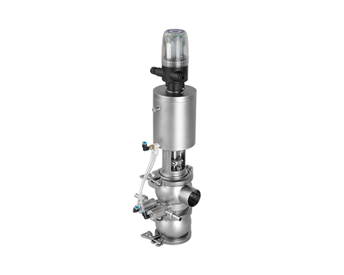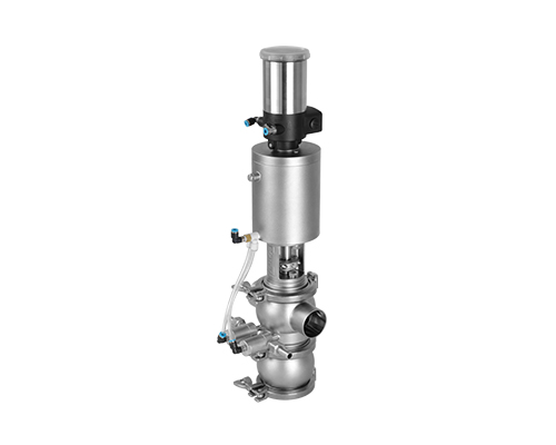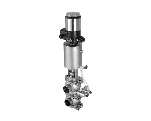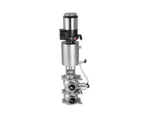 E-C系列防混閥主要由執(zhí)行機(jī)構(gòu)、連接支架、閥桿、閥體組成,閥桿通過執(zhí)行器機(jī)構(gòu)驅(qū)動(dòng)做軸向直線運(yùn)動(dòng),閥桿向上運(yùn)動(dòng)時(shí),上下管路通道開啟;閥桿向下運(yùn)動(dòng)時(shí),通道關(guān)閉。閥桿上設(shè)計(jì)有兩道密封圈與閥體密封面形成獨(dú)立的密封腔,與CIP閥相通,可用于密封檢漏;或上下管路流通不同介質(zhì)時(shí)起到防混監(jiān)測的作用。
